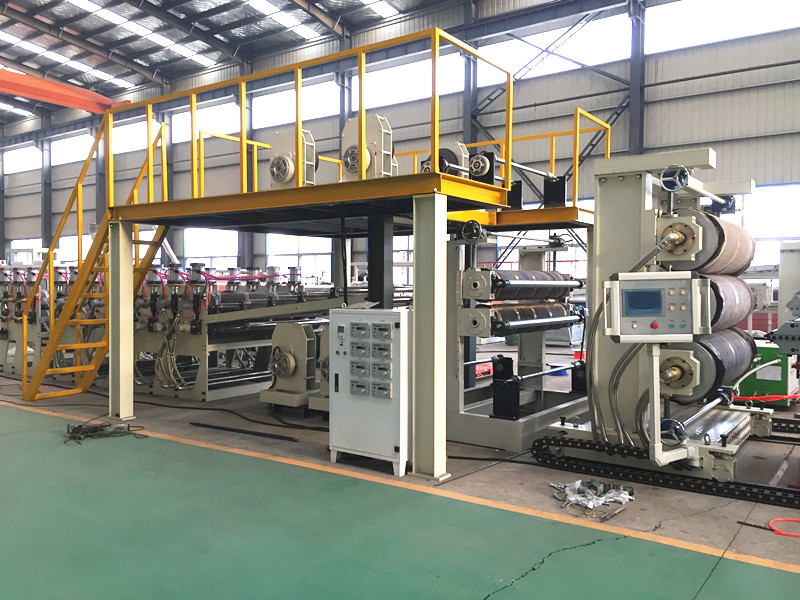 Η γραμμή παραγωγήςΗ σύνθετη κεφαλή μήτρας διαθέτει δομή σε σχήμα Τ και είναι κατασκευασμένη από χάλυβα καλουπιού P20, με τραχύτητα επιφάνειας καναλιού ροής Ra 0,05 μm. Η κεφαλή μήτρας έχει εννέα ζώνες θέρμανσης, θερμαντική ισχύ 27 kW και μέγιστο πλάτος παραγωγής 1.300 mm, επιτρέποντας τον ακριβή έλεγχο του πάχους και της επιπεδότητας του εξωθημένου πυρήνα PE. Το καλντερί τριών ρολών έχει μια αποτελεσματική διάσταση επιφάνειας εργασίας 500 × 1.500 mm. Η ταχύτητα γραμμής μπορεί να ρυθμιστεί με ακρίβεια από 0,5 έως 8 m/min χρησιμοποιώντας ένα σύστημα ελέγχου μεταβλητής ταχύτητας ABB, εξασφαλίζοντας λεία επιφάνεια φύλλου.