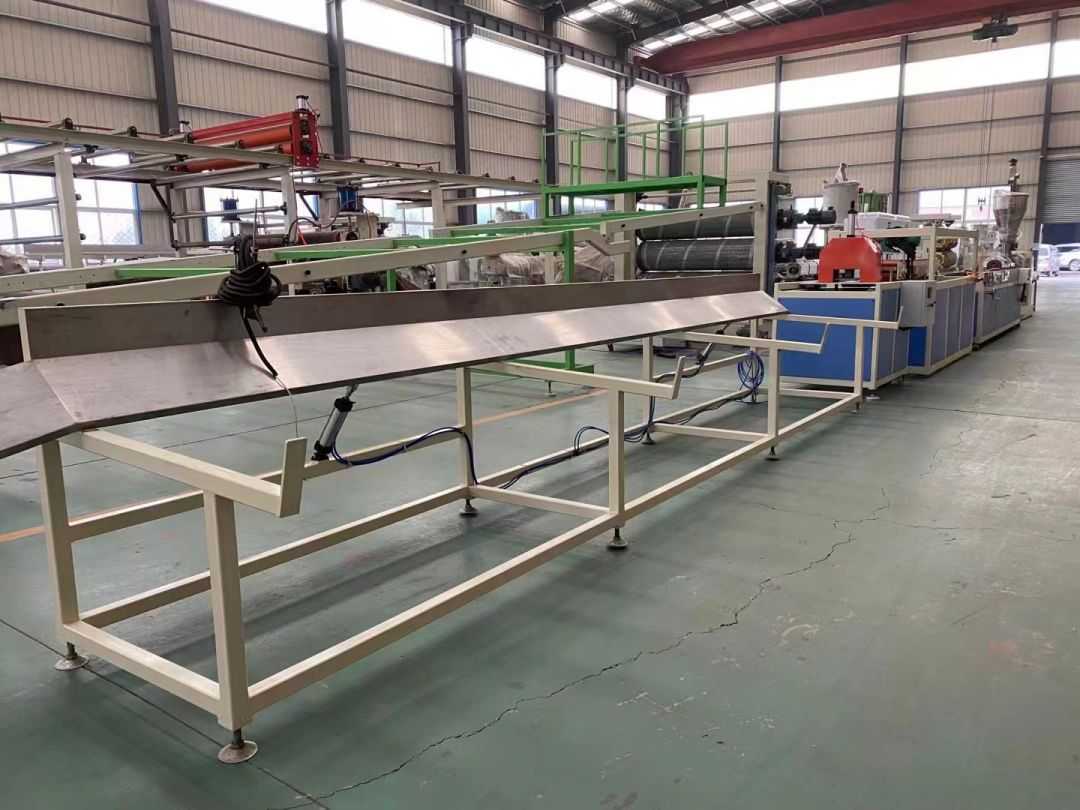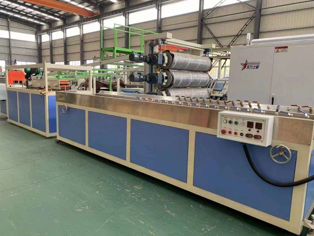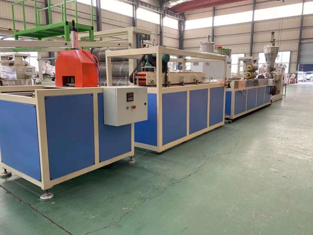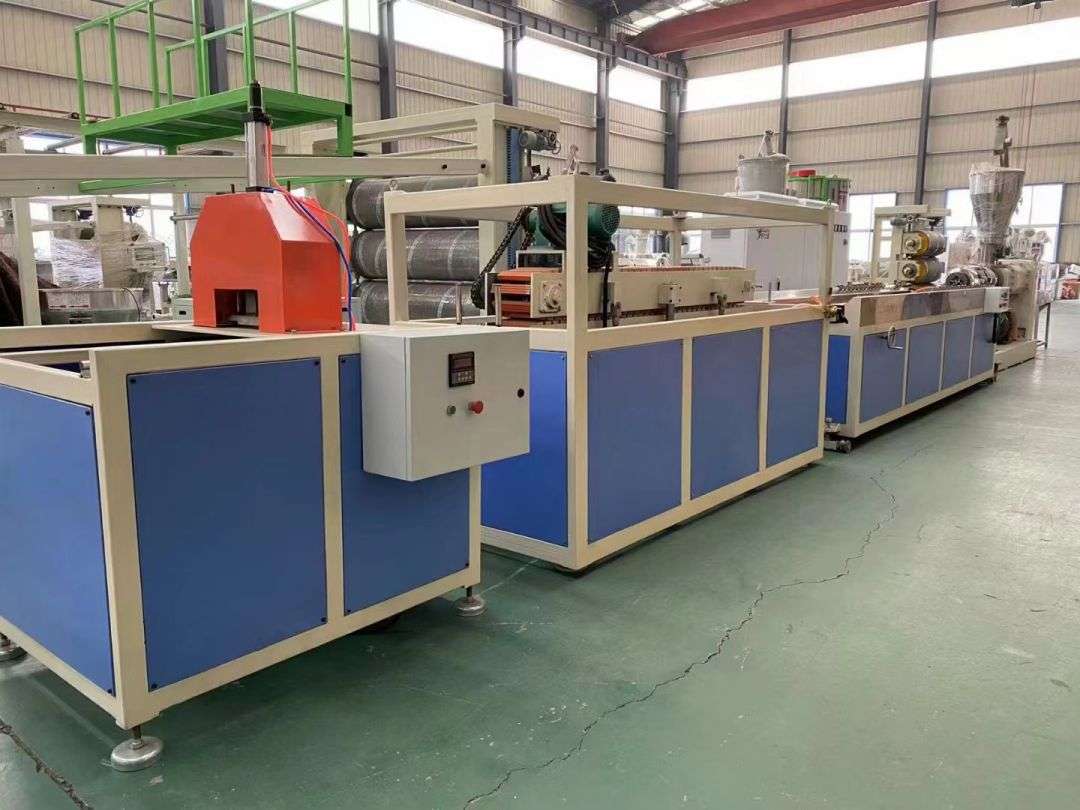 Η γραμμή παραγωγής προφίλ χρησιμοποιεί κωνικούς εξωθητήρες διπλής βίδας σειράς SJSZ-65/132, πλατφόρμες διαμόρφωσης κενού από ανοξείδωτο χάλυβα, τρακτέρ ερπυστριοφόρου, ενσωματωμένες μηχανές αυτόματης κοπής και αναδιπλούμενα ράφια εκφόρτωσης. Η πλατφόρμα διαμόρφωσης είναι εξοπλισμένη με αντλία κενού υψηλής πίεσης και αντλία νερού, οι οποίες ρυθμίζονται τετραδιάστατα. Το τρακτέρ είναι συσφιγμένο πνευματικά. Η αυτόματη μηχανή κοπής σταθερού μήκους χρησιμοποιεί έναν διακόπτη ταξιδίου για να κόψει σε ένα σταθερό μήκος. Η σχάρα στοίβαξης έχει μήκος 6 μέτρα, είναι κατασκευασμένη από ανοξείδωτο χάλυβα και αναποδογυρίζεται πνευματικά.