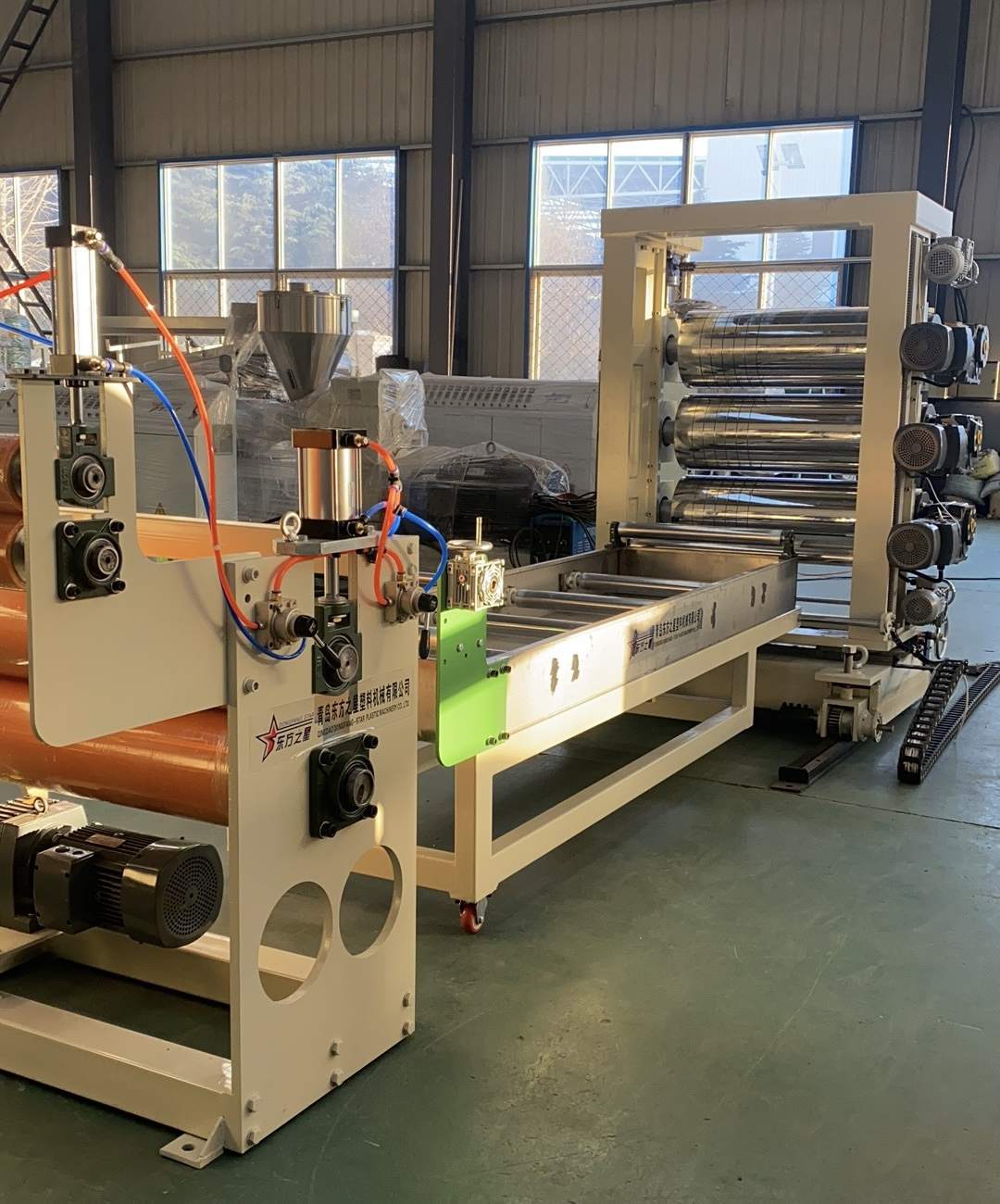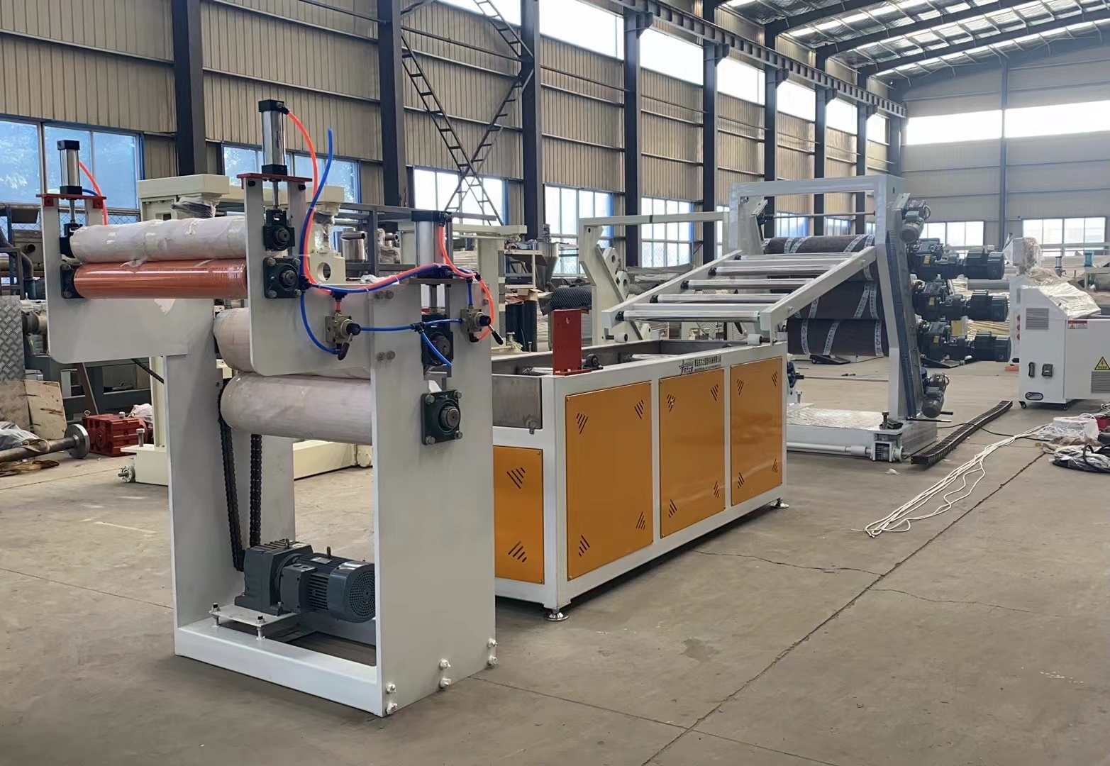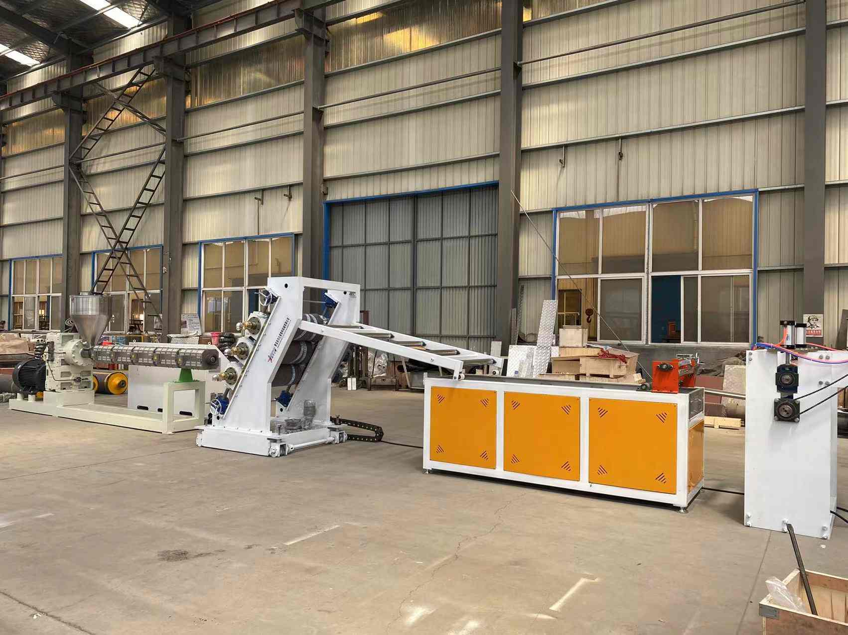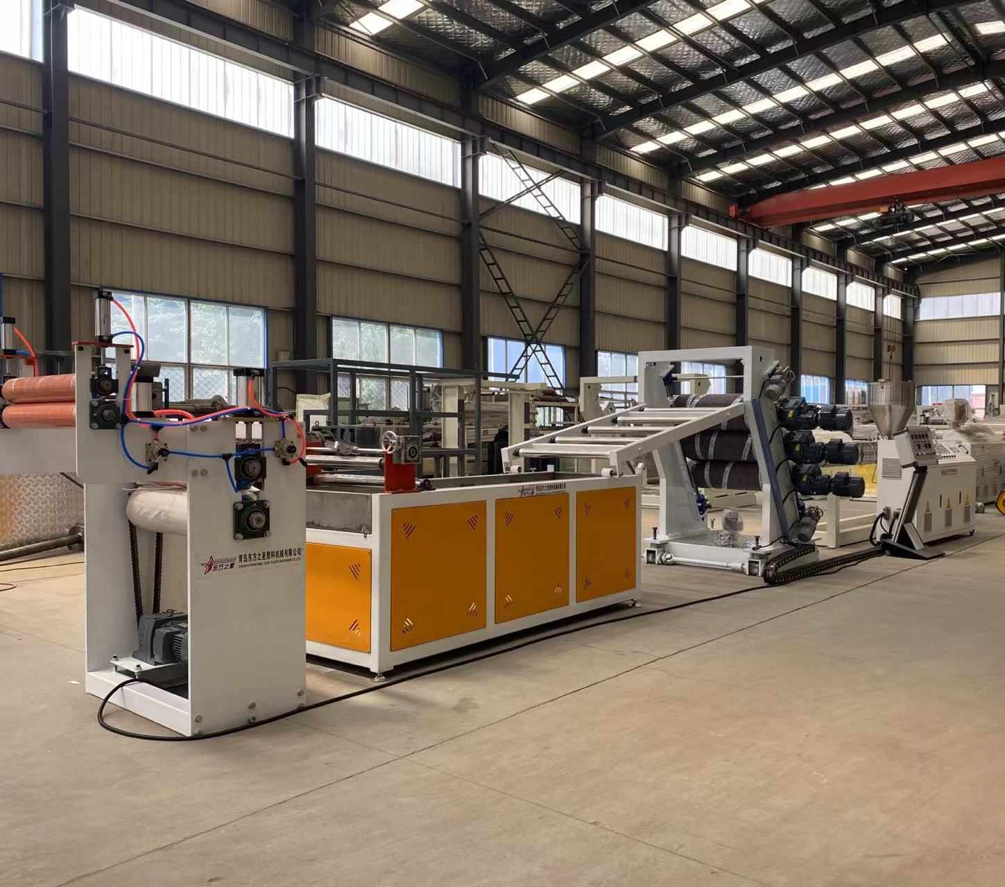 Γραμμή παραγωγής για PVC διαφανείς μαλακές κουρτίνες πόρτας: Δυνατότητα παραγωγής διαφανών πλαστικών φύλλων PVC με πλάτος που κυμαίνεται από 200 έως 600 χιλιοστά και πάχος 0,8 έως 3 χιλιοστά. Ο εξοπλισμός περιλαμβάνει έναν εξωθητήρα μονής βίδας SJ90 ή SJ-120, μια ρυθμιζόμενη εύκαμπτη μήτρα σχήματος Τ, ένα κάλυμμα τριών κυλίνδρων με κάθετη ή κλίση 45 μοιρών, έναν ελεγκτή θερμοκρασίας νερού τρία σε ένα, ένα βραχίονα ψύξης από ανοξείδωτο χάλυβα εξοπλισμένο με ρυθμιζόμενο κύλινδρο πλάτους, ρυθμιζόμενο μηχάνημα κοπής με ρολό μεγάλου πλάτους και arubni. περιέλιξη άξονα διαστολής αέρα. Τα παραγόμενα φύλλα έχουν γυαλιστερή επιφάνεια, υψηλή διαφάνεια, απαλότητα, χωρίς ρωγμές, χωρίς οσμή, χωρίς φυσαλίδες και είναι εύκαμπτα, ανθεκτικά στο κρύο, ανθεκτικά στη φθορά, ανθεκτικά στα οξέα και στα αλκάλια και στη διάβρωση.
