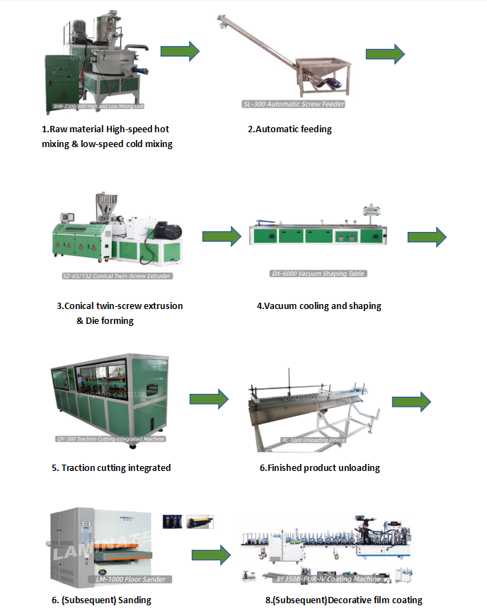 Μια πλήρης γραμμή παραγωγής δαπέδων SPC ενσωματώνει ένα σύνθετο σύστημα πολλαπλών μονάδων ακριβείας για να εξασφαλίσει την ανώτερη ποιότητα του τελικού προϊόντος.